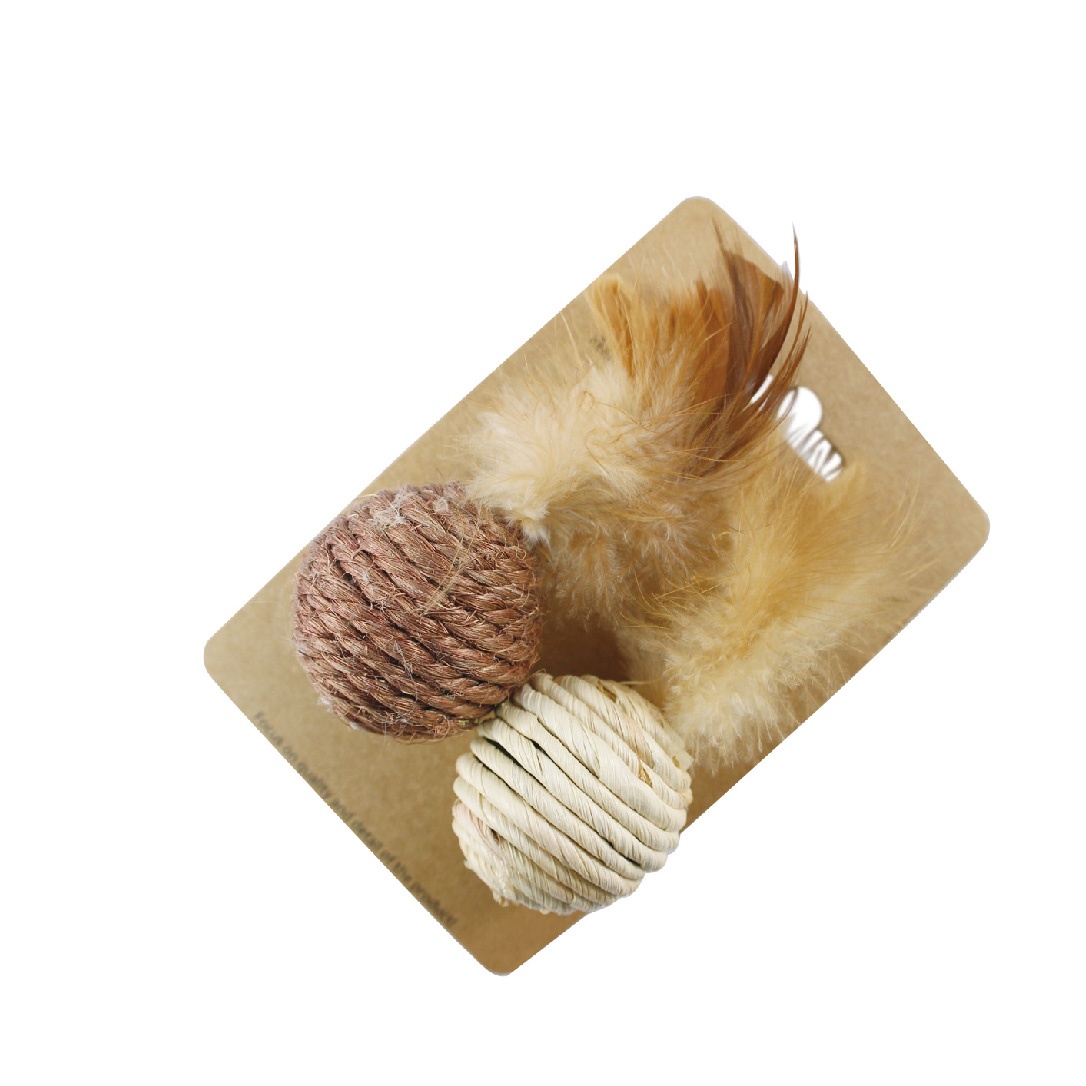 Assorted sisal ball and paper ball cat toy with natural feather.